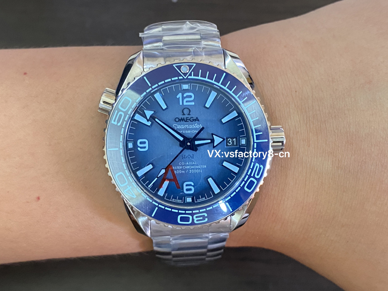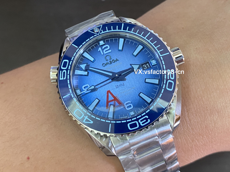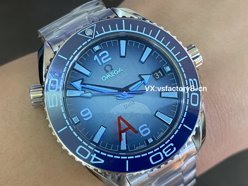 4:VS厂这款欧米茄海马600米复刻表采用了冰蓝色的表盘,不仅有着出色的外观设计,且在细节把握上也很到位,蓝色的陶瓷表盘经过PVD工艺处理,所以能呈现出渐变效果的光泽,这一个细节是确确实实做到了对版正品,醒目的蓝色指针和小时刻度,并且都覆有独特的浅蓝色瑞士夜光涂层,盘面英文印刷字体细节非常精湛,彰显了VS厂最强复刻细节工艺。