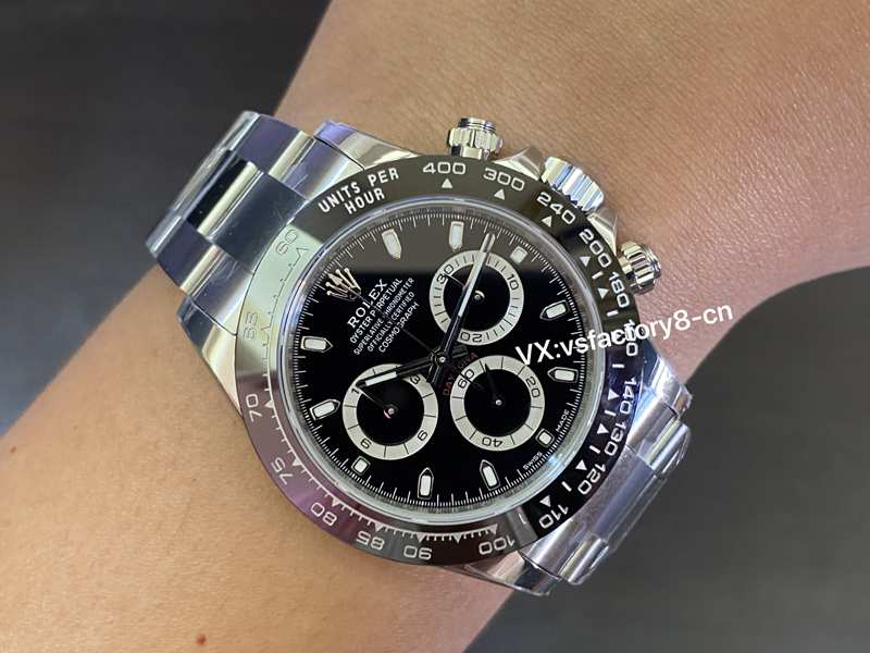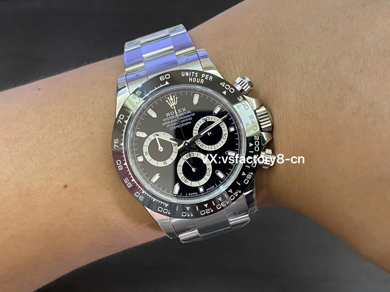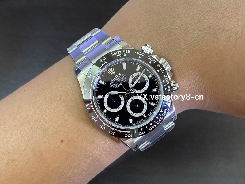 1:VS厂在复刻劳力士迪通拿黑陶迪时,极其注重外形的精准还原,在外观表壳上使用了904L精钢材质锻造,表壳侧面同时经过严谨的打磨以及抛光工艺处理,从而看出表壳的细节完美展现原版一致的质感,表壳的曲线都力求与正品保持一致,经过严格的测量和对比,VS厂的装表师傅们将每一处细节都进行了精细的调整,使得VS厂这款黑陶迪复刻表在视觉上几乎可以以假乱真。