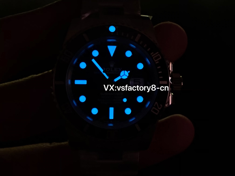 5:VS厂在劳力士黑水鬼的表盘上使用了黑色搪瓷表盘复刻还原,黑色表盘搭配白色时标与指针,识别度极高,时标与时针的涂层都经过了特殊处理,即使在昏暗的环境下,依然清晰可见,十二点大皇冠LOGO复刻还原,三点位置设计日历窗,表盘上的英文字体细节一步到位。