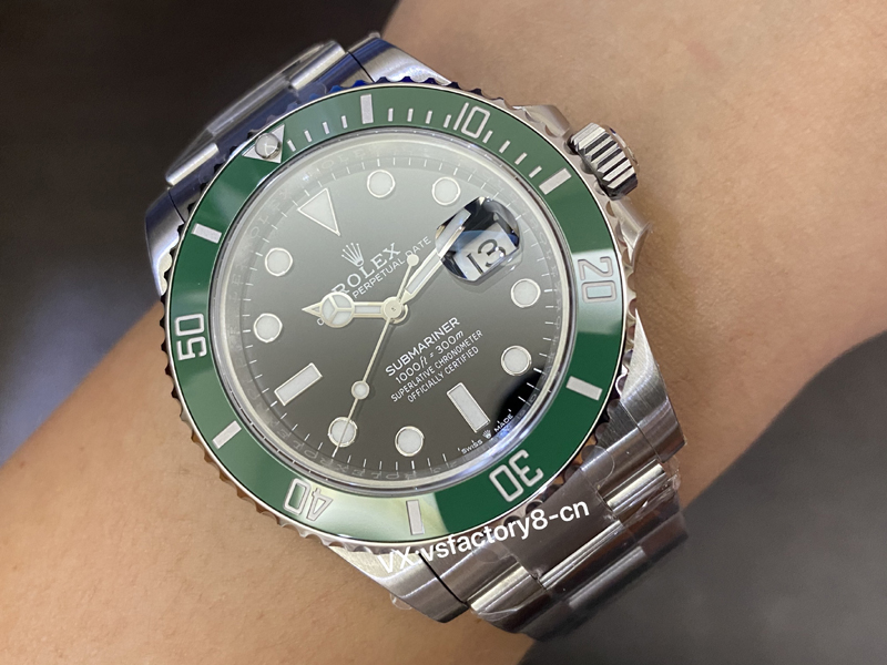 1:VS厂在复刻还原设计劳力士三代绿水鬼时,旨在尽可能还原正品的外观细节,首先,从表壳的材质来看,采用高质量的904L精钢材质锻造,904L精钢这种材质不仅防锈耐腐蚀,还具备了良好的耐磨性,表壳经过精细打磨,表面光泽度极高,与正品非常接近。