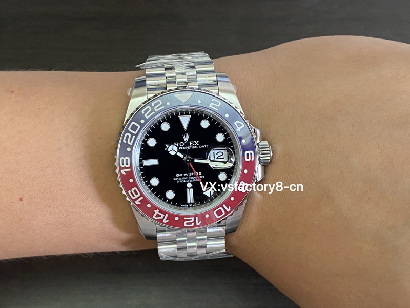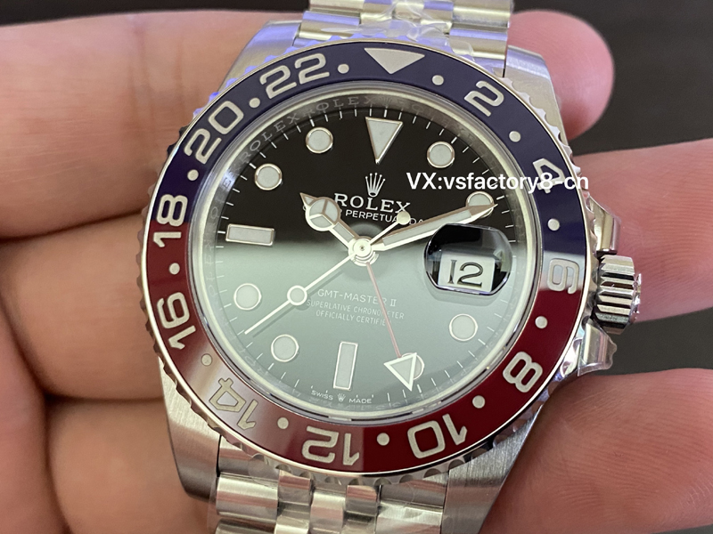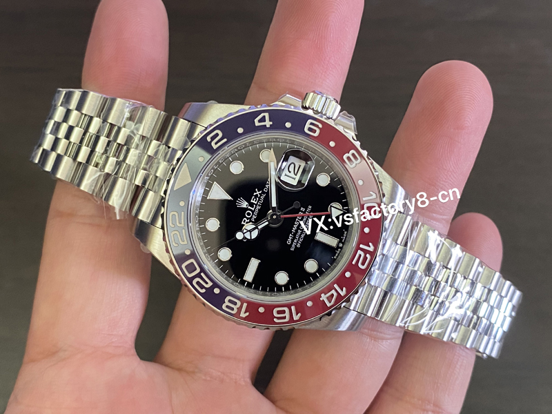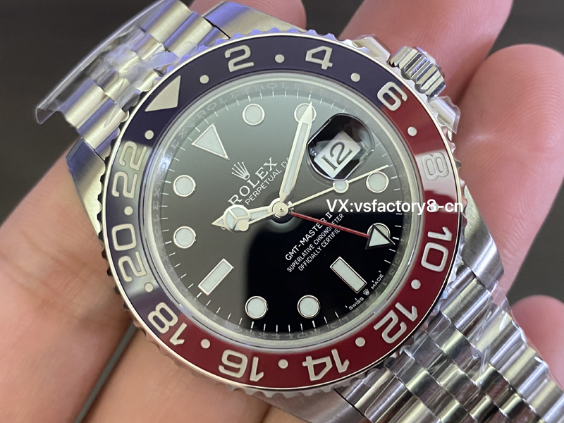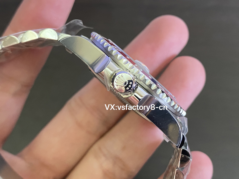 VS厂可乐圈设计的特别之处在于其双色陶瓷表圈,蓝色与红色的交替设计极具辨识度,而这一点VS厂按照原版一致复刻还原蓝红双交一体圈,这一点细节做工做到了完全对版,VS厂在这一部分下了很多功夫,通过高温烧制工艺确保颜色的饱满与持久,力求在一定程度上还原正品的颜色,表圈的刻度清晰且准确,转动顺滑自如,也是复刻领域中做工最好的一个复刻表版本。