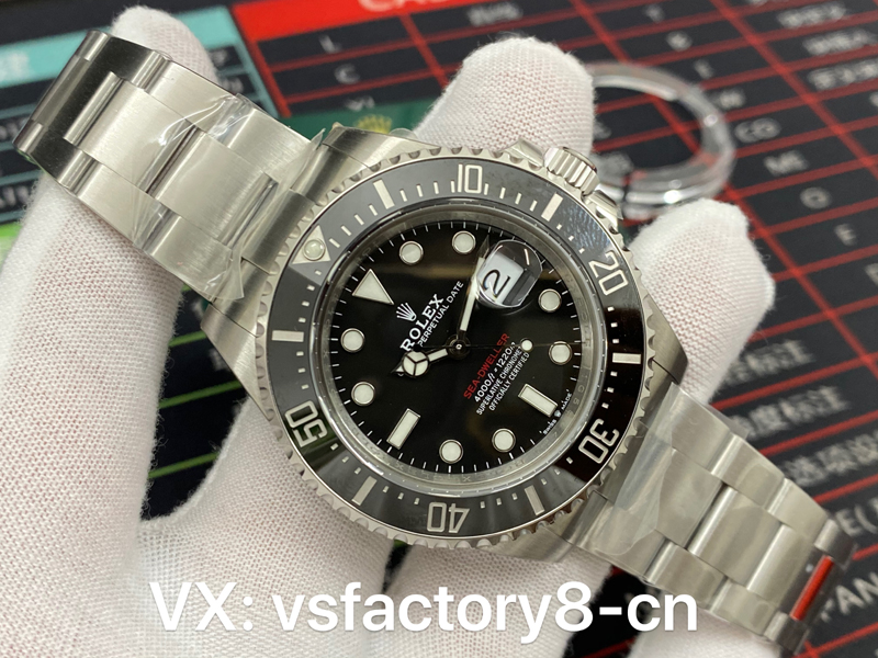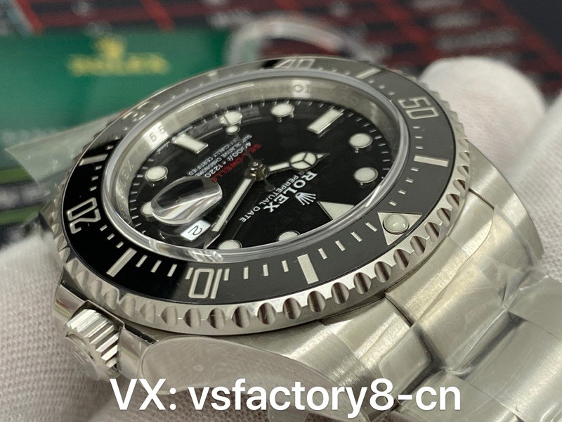 VS厂劳力士43m单红鬼王表盘采用了黑色,质感十足的黑色表盘上,经过PVD镀膜技术之后的时标显得更加细致,搭配SEA-DWELLER红色字体,使得整体视觉冲击力强烈,表盘的时标和刻度都十分清晰,打磨的非常圆润,字体细节做工非常立体,刻度和指针均填充了瑞士夜光粉涂层,确保了在暗光环境下依然能读时。