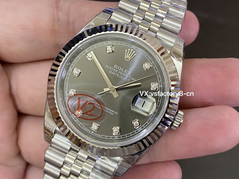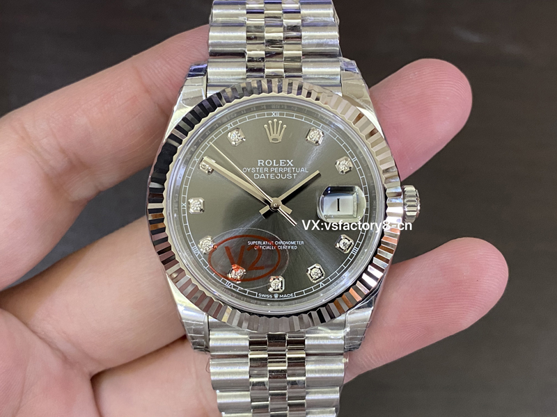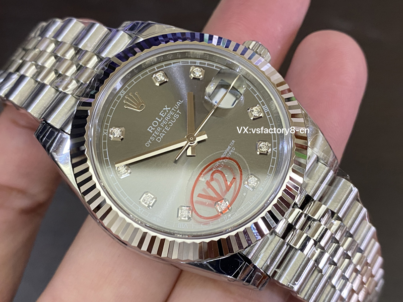 最引起广泛关注的还是表盘还原,VS厂在表盘上根据原版一致开发放射纹灰面盘,并且表盘上的刻度则采纳了台湾莫桑钻,并非皓石充当,做到了正版一致闪亮光泽,深邃的灰色调与钻石时标的结合,非常的响亮,尤其是在阳光的照射下,灰色的表面呈现出令人惊叹的光影变化,做到了原汁原味,指针上边缘打磨圆润,十二点刻度大皇冠LOGO非常立体,盘面英文印刷细节很精湛,VS厂确实在细节做工还原非常高。